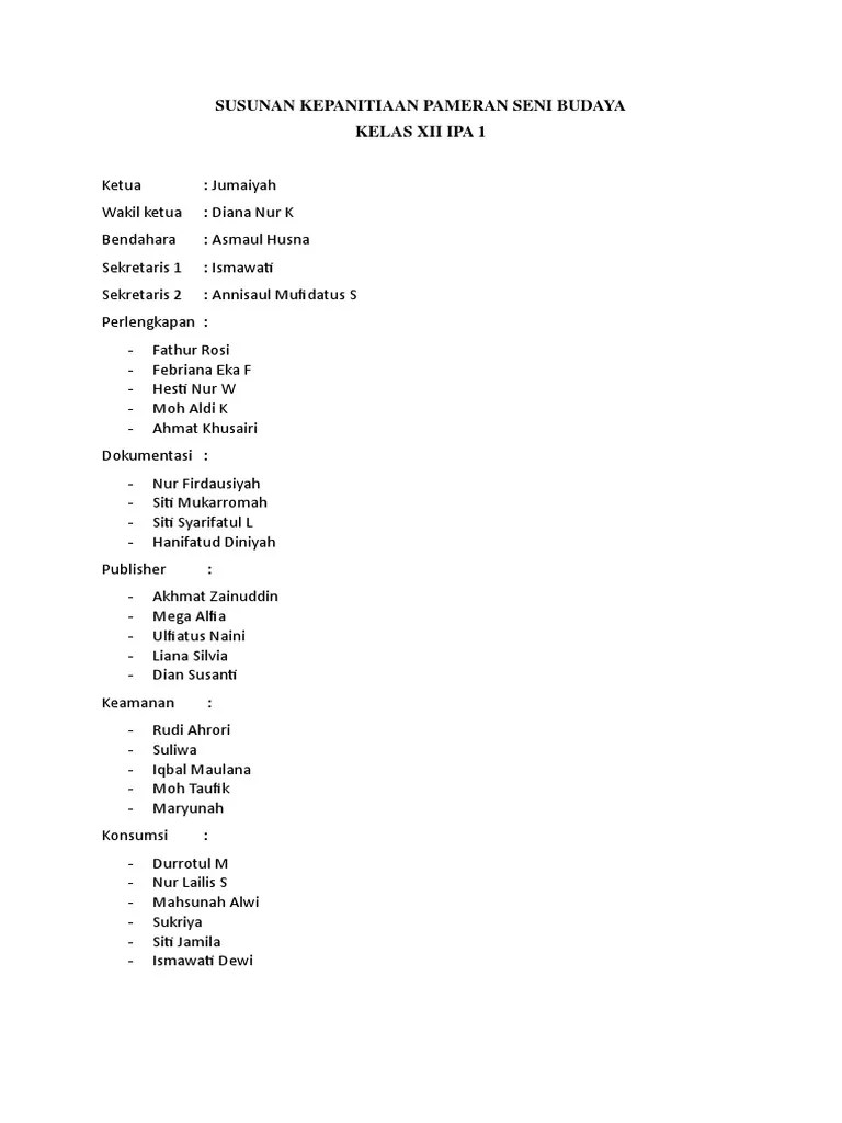 Buatlah Susunan Kepanitiaan Pameran Yang Diselenggarakan Di Sekolah Anda : Http Repositori Kemdikbud Go Id 21633 1 Xi Seni Rupa Kd 3 3 Final Pdf / Berikan alasan kalian terhadap pilihan nama yang kalian tentukan tersebut.. Jelaskan tugas dari ketua pelaksana dalam kepanitian pameran seni rupa. Tuangkan hasil perencanaan tersebut dalam laporan kelompok! Pengertian, jenis, dan contoh proposal. Karya yang dikumpulan sudah barang tentu sangatlah banyak. Didalam bagian ini umumnya berisikan mengenai susunan kepanitiaan yang bertanggung jawab atas terlaksananya suatu acara yang diadakan.